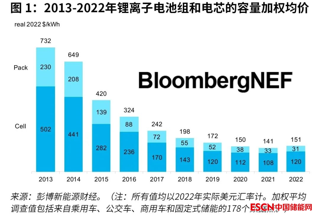 中國儲能網(wǎng)訊:鋰離子電池組價格由于原材料和電池零部件價格上漲和通脹飆升,出現(xiàn)了自彭博新能源財經(jīng)2010年開始跟蹤該市場以來的首次上漲。在經(jīng)歷十余年的下跌之后,所有細(xì)分市場的鋰離子電池組按容量加權(quán)平均的價格在2022年升至151美元/千瓦時,較去年上漲7%。盡管如磷酸鐵鋰(LFP)等低成本材料體系在加速普及,但仍不足以抵消整體電池成本的上漲壓力。彭博新能源財經(jīng)預(yù)計明年價格將與今年持平,再次打破多年保持連續(xù)下降的趨勢。