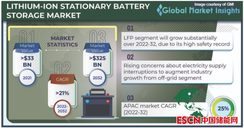 Global Market Insights分析師預(yù)計(jì)2032年,受成本大幅下降的推動(dòng),鋰離子電池固定存儲(chǔ)市場(chǎng)將達(dá)到3,270億美元。