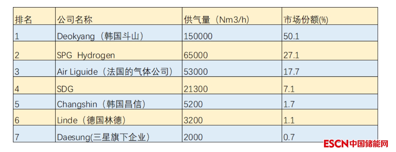 氫氣供應(yīng)方面,韓國擁有三大石化綜合體,各有一家大型煉油廠:1)蔚山(SK Energy和S Oil),2)Yeosu(GS Caltex),和3)Seosan/Daesan(現(xiàn)代Oilbank)。大約90%是當(dāng)?shù)氐臍錃馍a(chǎn)作為副產(chǎn)品分配給客戶的,其中,斗山是韓國最大的氫氣供應(yīng)商。