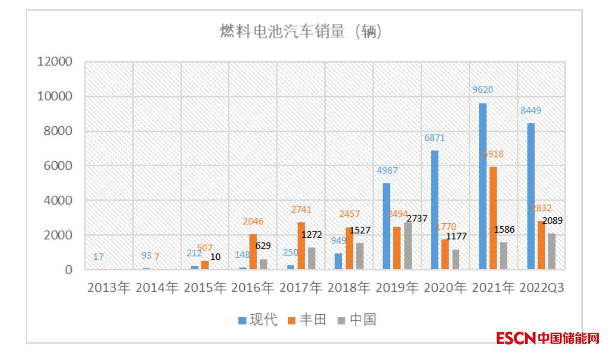 考慮到美國和歐洲目前主要的燃料電池汽車來源于進口(日本、韓國),我們暫且只比較韓國現(xiàn)代、日本豐田和中國的汽車銷量數(shù)據(jù),韓國現(xiàn)代2013年-2022Q3累計銷售燃料電池汽車31596輛,日本豐田2014年-2022年Q3累計銷售燃料電池汽車20772輛,中國2015-2022年Q3累計銷售11027輛。韓國一家企業(yè)累計銷售是中國的近三倍,今年前三季度8449輛,是中國銷量的四倍。