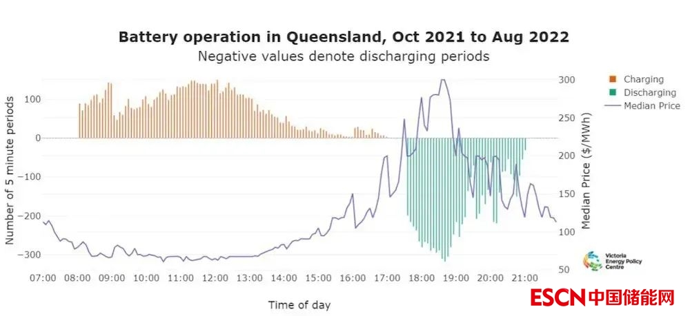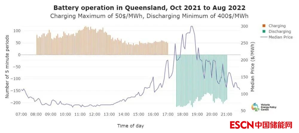 相反,可以看到,電池很可能在下午5點(diǎn)30分至7點(diǎn)30分放電,此時(shí)價(jià)格往往是最高的(圖表中的藍(lán)線是昆士蘭在每個(gè)區(qū)間的現(xiàn)貨價(jià)格中值)。