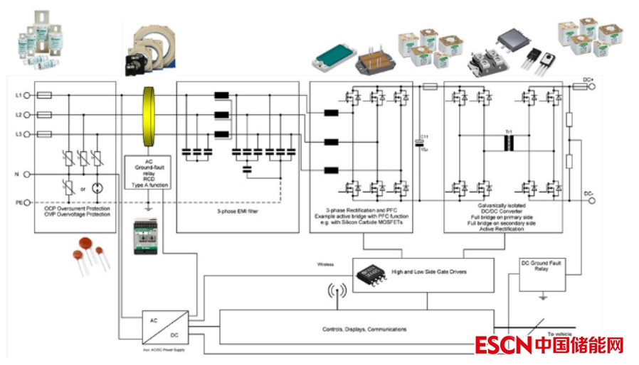 通常來說,充電器采用模塊化方法從可以堆積輸出功率的子系統(tǒng)中構(gòu)建。大多數(shù)標(biāo)準(zhǔn)設(shè)計(jì)每個(gè)子系統(tǒng)的功率為15-60 kW,元件的選擇因功率輸出需求和冷卻偏好而不同。雖然10kW至15kW的強(qiáng)制空氣冷卻機(jī)組廣泛采用離散設(shè)備,但更高功率機(jī)組使用液體冷卻,主要由多個(gè)功率模塊構(gòu)成。