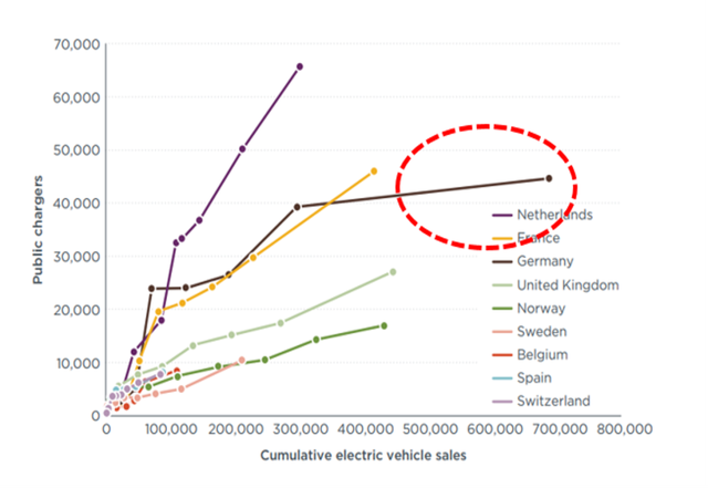 不過,在建設(shè)公共充電系統(tǒng)網(wǎng)絡(luò)方面,德國目前仍有很大的提升空間。首先,根據(jù)2021年10月的數(shù)據(jù),相較于歐洲其他國家,德國的充電樁數(shù)量并沒有隨著新能源汽車的普及而有效增長。