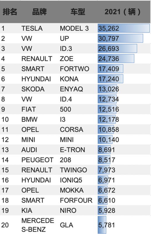 如果我們具體到車型,2021年的德國又有哪些暢銷的新能源車型呢?