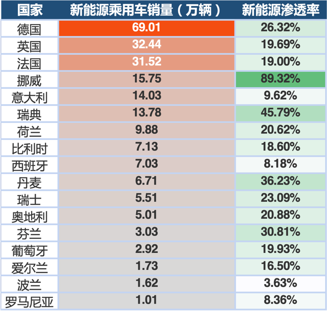 德國新能源汽車市場處于高速的發(fā)展中。根據(jù)市場調(diào)研機構(gòu) INSIDEEVs 的數(shù)據(jù),2021年,德國是全球除了中國外最大的新能源汽車市場,以69.01萬輛的銷量居歐洲第一 ,同比增長72.7%。同時,德國新能源汽車的新車滲透率為26.32%,同比增長約100%,是全球除北歐四國外最高的。相較之下,歐洲另外三大經(jīng)濟體,英國和法國的新能源車滲透率不到20%,意大利則僅有9.62%。