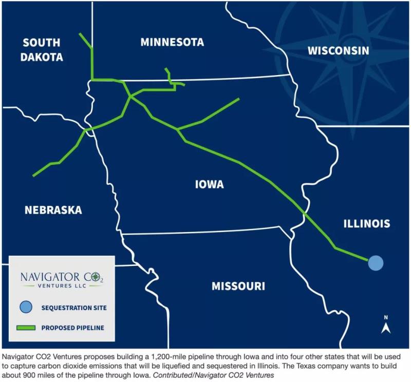 總部位于德克薩斯州的Navigator CO2公司稱其項(xiàng)目為Heartland Greenway System(“腹地綠道系統(tǒng)”),計(jì)劃在愛荷華州的36個(gè)縣修建約900英里的管道,并延伸到伊利諾斯州、內(nèi)布拉斯加州、明尼蘇達(dá)州和南達(dá)科他州,管道總長(zhǎng)度1300英里。Summit公司表示將從31家生物燃料工廠捕集和封存碳;Navigator已與20家乙醇和化肥廠達(dá)成碳捕集和封存協(xié)議。