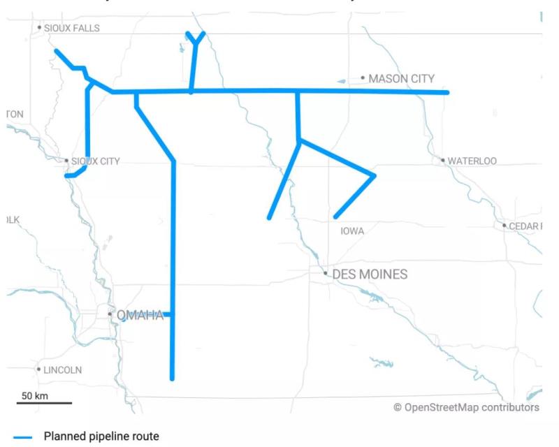 Summit公司的管道項(xiàng)目稱為 “中西部碳快車”(Midwest Carbon Express),建議在愛荷華州99個(gè)縣中的30個(gè)縣修建近710英里的管道,并延伸至另外四個(gè)州:明尼蘇達(dá)州、北達(dá)科他州、南達(dá)科他州和內(nèi)布拉斯加州,管道總長(zhǎng)將達(dá)2000英里。