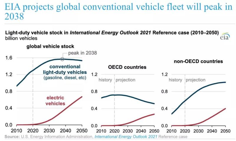 美國(guó)能源信息署發(fā)布《2021年國(guó)際能源展望》(International Energy Outlook 2021),估計(jì)2020年全球輕型汽車(LDV)總量為13.1億輛,預(yù)計(jì)到2050年輕型汽車總量將增長(zhǎng)至22.1億輛。EIA預(yù)計(jì)電動(dòng)汽車(EV)將從2020年占全球輕型汽車總量的0.7%增長(zhǎng)到2050年的31%,達(dá)到6.72億輛。在整個(gè)預(yù)測(cè)期內(nèi),電動(dòng)汽車銷售和銷售份額的顯著增長(zhǎng)導(dǎo)致全球常規(guī)汽油和柴油車數(shù)量在2038年達(dá)到峰值。