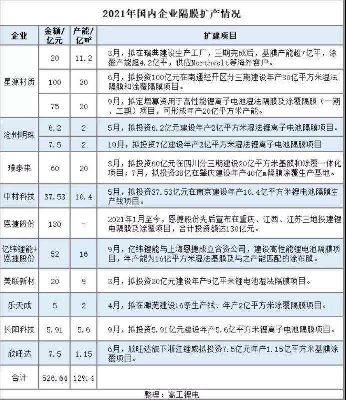 年初以來,頭部動力電池企業(yè)密集擴(kuò)產(chǎn)啟動,為匹配電池端需求,隔膜企業(yè)開啟大規(guī)模擴(kuò)產(chǎn)模式。