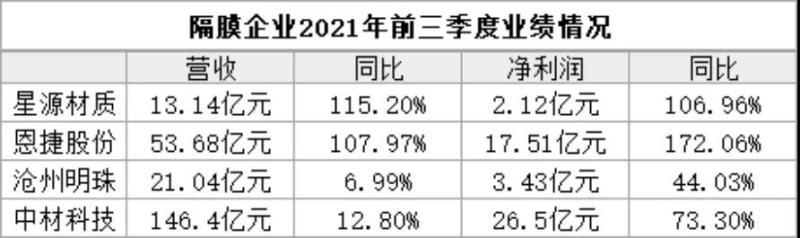 需求拉動下,頭部隔膜企業(yè)幾乎滿產(chǎn)滿銷,帶動業(yè)績大幅增長,其中星源材質(zhì)、恩捷股份Q3凈利均同比翻番。
