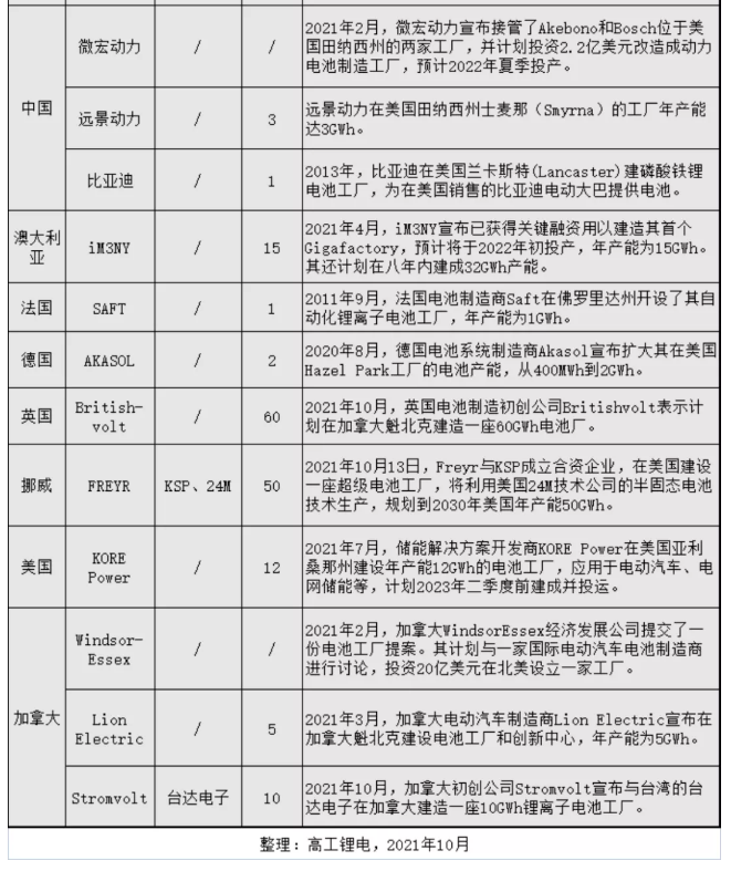 可供對比的是,截止2021年3月的數(shù)據(jù)是,美國電池制造能力僅為59GWh。僅半年的時(shí)間,全球電池企業(yè)和車企集體奔赴北美建造“超級工廠”,讓一度“萎縮”的北美電池圈開始“膨脹”。