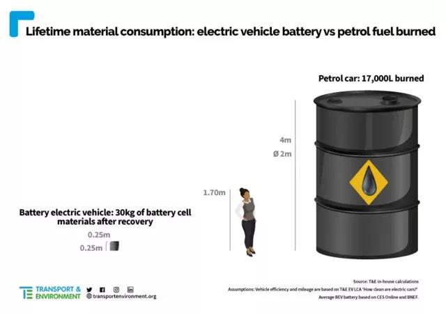電池網(wǎng)注意到,今年3月份,T&E的運輸和電動汽車分析師Lucien Mathieu曾表示,燃油車與電動汽車在原材料方面,根本沒有可比性。在全生命周期中,一輛普通的化石燃料汽車燃燒相當(dāng)于一疊25層高的油桶。而如果考慮到電池材料的回收利用,電動汽車只會損失大約30公斤的金屬——大約相當(dāng)于一個足球的大小。