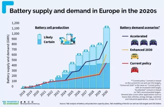 T&E報告指出,想要達(dá)到如此數(shù)額的年供應(yīng)量并不容易,期間仍然會嚴(yán)重依賴亞洲電池和技術(shù),這種情況甚至?xí)恢背掷m(xù)到2029-2030年。