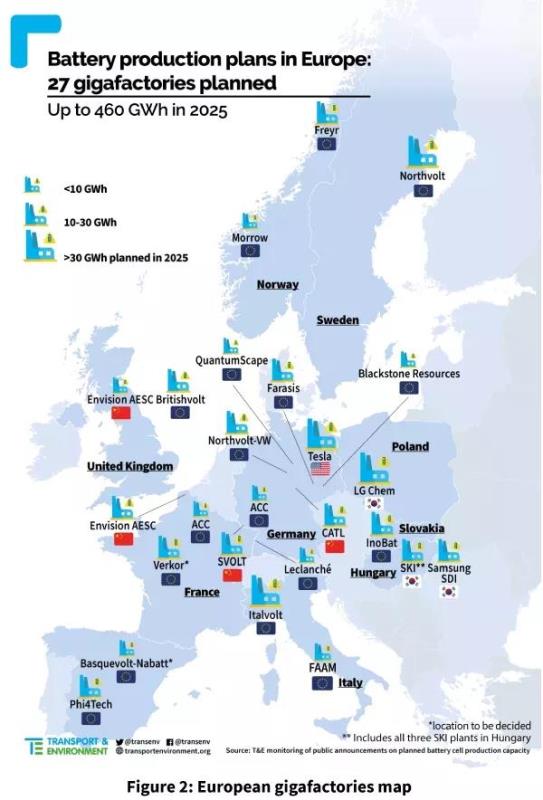歐盟非政府組織運輸與環(huán)境聯(lián)合會6月份發(fā)布的一份報告顯示,歐洲現(xiàn)有項目中已建設(shè)或正在建設(shè)的超級工廠總數(shù)達(dá)到38個,預(yù)計總年產(chǎn)量為1000GWh,相當(dāng)于生產(chǎn)1670萬輛純電動汽車用電池。