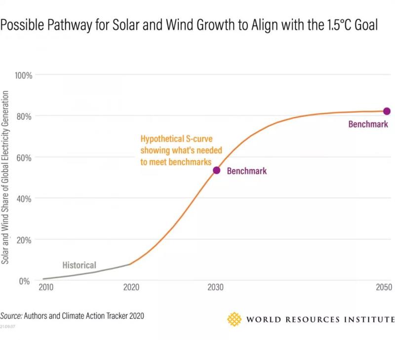 盡管勢頭明顯,但可再生能源的增長速度必須進(jìn)一步加快,而具體需要加快多少仍存在很大的不確定性。下圖說明了太陽能和風(fēng)能如何達(dá)到將全球變暖限制在1.5攝氏度所需的氣候目標(biāo)的一個潛在途徑。