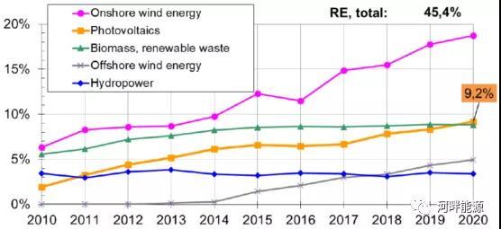 由圖4可見,2016年以來,陸上風電、光伏發(fā)電和海上風電占比較快增長,生物質能發(fā)電和水電占比保持平穩(wěn)。2020年可再生能源發(fā)電量在德國電能消費占比達到45.4%,創(chuàng)下新高。