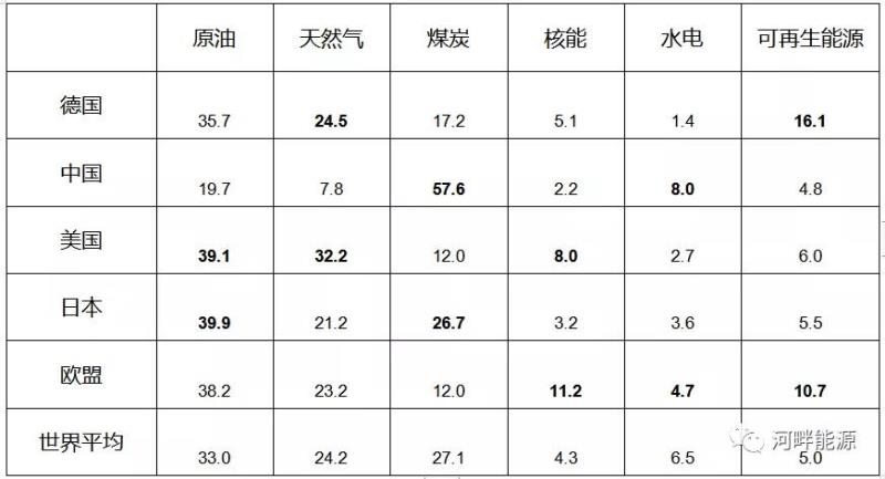 表3給出了2019年德國與世界主要經(jīng)濟體的能源消費結構的比較(數(shù)據(jù)來自《BP能源統(tǒng)計評論2021》)。