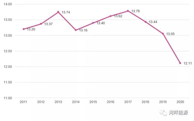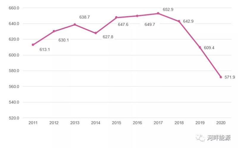 根據(jù)《BP能源統(tǒng)計評論2021》,2019、2020年德國一次能源消費量分別相當于中國的9.1%和8.3%。2011-2020年德國一次能源消費量成“M”,2017年以來,呈現(xiàn)單調(diào)下降趨勢。近十年德國一次能源消費量如下圖。