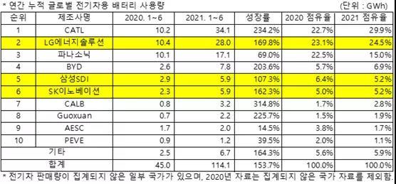 OFweek鋰電網(wǎng)注意到,根據(jù)比亞迪早前發(fā)布的產(chǎn)銷快報(bào),2021年上半年新能源汽車動(dòng)力電池及儲(chǔ)能電池累計(jì)裝機(jī)總量約為12.707GWh。而在這份榜單中,比亞迪今年1-6月裝機(jī)量為7.8GWh,遠(yuǎn)低于比亞迪給出的數(shù)據(jù)。