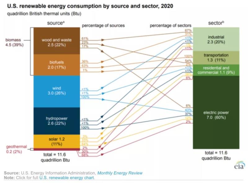 ——2020年,木材和廢棄物能源(包括木材、木屑和垃圾填埋場產(chǎn)生的生物質(zhì)廢棄物)約占美國可再生能源消費(fèi)量的22%;工業(yè)、商業(yè)和電力設(shè)施將木材和廢棄物用作發(fā)電、制熱和制造商品的燃料。