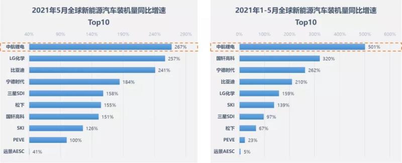 5月全球動(dòng)力電池裝機(jī)總量20.5GWh,同比增長(zhǎng)193%;中航鋰電裝機(jī)量0.73GWh,同比增長(zhǎng)267%,為全球增速最快的動(dòng)力電池供應(yīng)商。