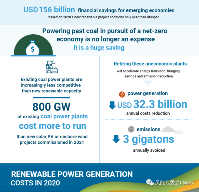 IRENA在官方報(bào)告新聞發(fā)布會(huì)上透露,新的報(bào)告證實(shí)可再生能源將為新興經(jīng)濟(jì)體節(jié)省 1560 億美元的成本,因此各國應(yīng)敦促不再使用煤炭發(fā)電。IRENA指出,與最具競(jìng)爭(zhēng)力的化石燃料相比,成本更低的可再生能源份額在 2020 年翻了一番。去年新增的 162 GW可再生能源發(fā)電或占可再生能源發(fā)電總量的 62% 的成本,已低于最便宜的新增化石燃料發(fā)電。