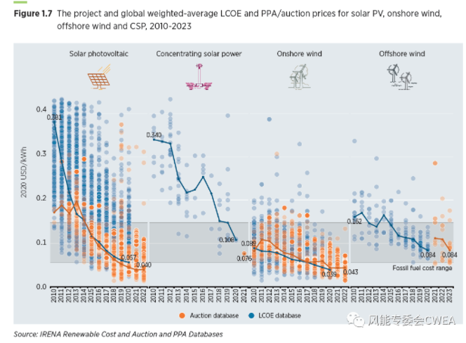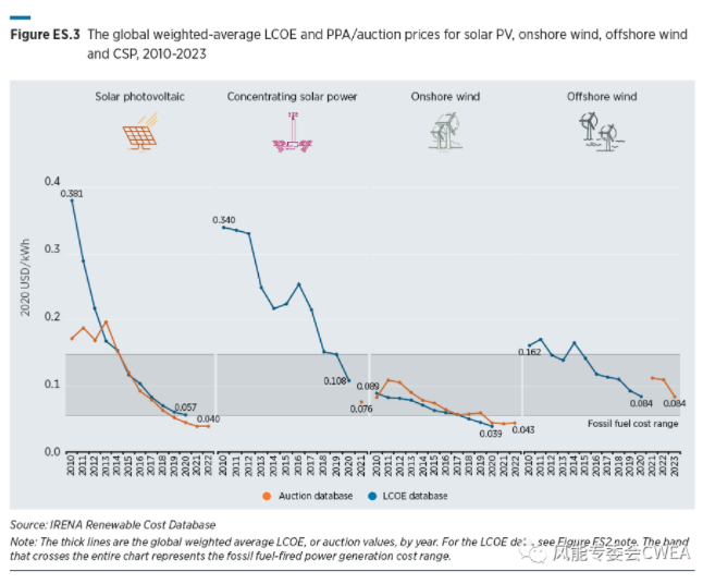 2010-2023年全球光伏、陸上和海上風(fēng)電、CSP平均加權(quán)LCOE和PPA拍賣價(jià)格變化情況