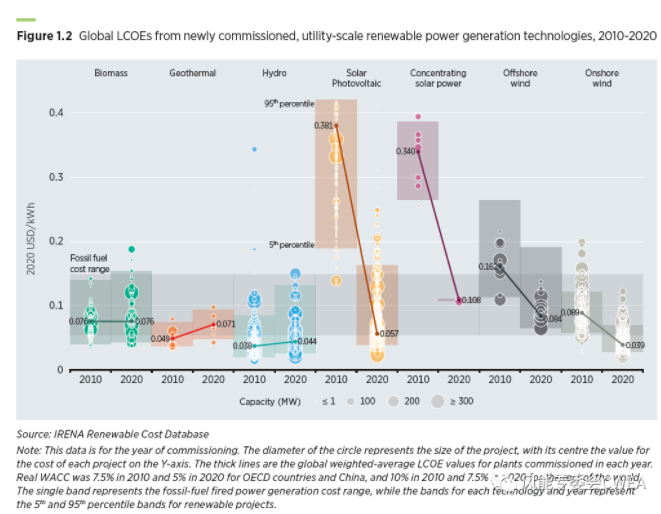 2010-2020年,全球新投產(chǎn)、公共事業(yè)規(guī)??稍偕茉窗l(fā)電廠按技術(shù)列出的LCOE成本區(qū)間,本圖列出了項(xiàng)目規(guī)模情況,用彩色圓點(diǎn)的直徑表示。