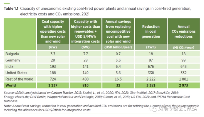 放眼全球,有超過 800 GW 的現(xiàn)有煤電成本均高于 2021 年投產(chǎn)的新建太陽能光伏或陸上風(fēng)電項(xiàng)目。關(guān)閉這些煤電廠每年可減少高達(dá) 323 億美元的發(fā)電成本,每年可減少約 3 吉噸的二氧化碳排放量,這個(gè)數(shù)據(jù)相當(dāng)于 2020 年全球能源相關(guān)二氧化碳排放量的 9%,IRENA《世界能源轉(zhuǎn)型展望》所述的 1.5°C 氣候目標(biāo)藍(lán)圖中到 2030 年目標(biāo)減排量的 20%。