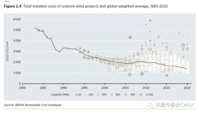 1983-2020年陸上風(fēng)電項(xiàng)目總安裝成本和全球加權(quán)平均情況