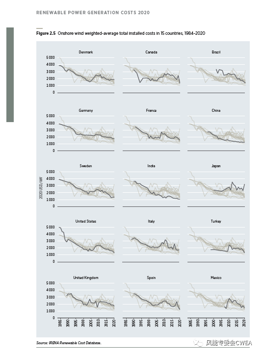 15個(gè)國家陸上風(fēng)電總安裝成本趨勢(shì)