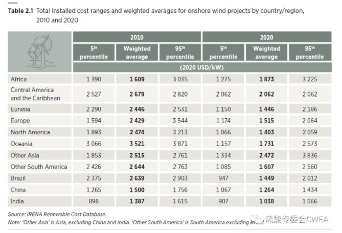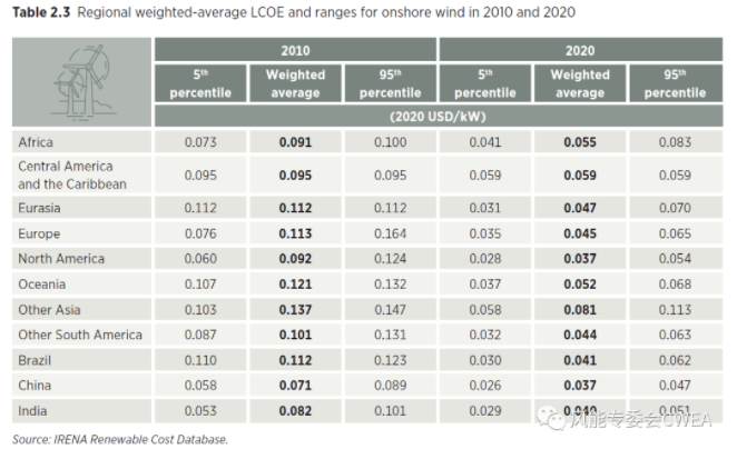 按國家地區(qū)分列的陸上風(fēng)電LCOE范圍和加權(quán)平均值(2010和2020年對(duì)比)