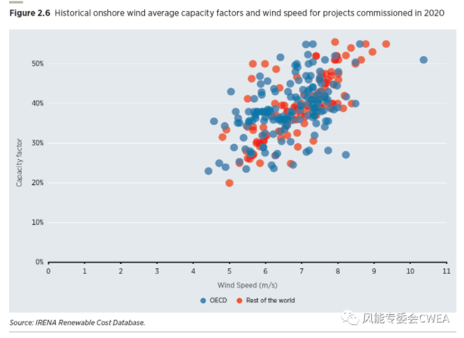 陸上風(fēng)電平均容量因子與風(fēng)速關(guān)系(分OECD和其他地區(qū))