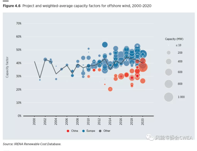 陸上風(fēng)電總安裝成本、容量因子和LCOE變化情況,可以看出容量因子提升和安裝成本的下降,導(dǎo)致LCOE的持續(xù)快速下降