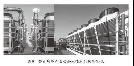 圖9為德國某運(yùn)營商風(fēng)冷冷機(jī)應(yīng)用實(shí)景。冷機(jī)配備了自然冷卻盤管,可在冬天實(shí)現(xiàn)自然冷卻。同時(shí)冷凝器配備了水噴淋,可在夏天降低冷凝壓力,提高制冷效率。