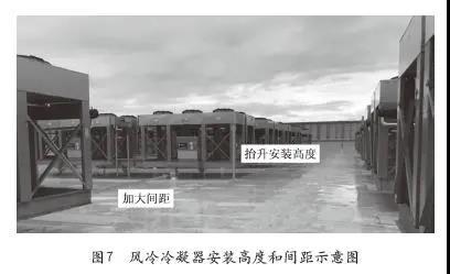 風(fēng)冷DX由于室外機(jī)占地面積大,容易產(chǎn)生熱島效應(yīng),往往不會被應(yīng)用于大型數(shù)據(jù)中心,但美國A運(yùn)營商美西某機(jī)房通過采取技術(shù)措施,規(guī)避了這些弊端。它采用高效微通道室外機(jī),同時(shí)通過鋼支架加高室外機(jī),增強(qiáng)室外機(jī)散熱效果,定期檢查室外機(jī)清潔情況,避免熱聚集效應(yīng)。風(fēng)冷冷凝器安裝高度和間距示意圖如圖7所示。此外,國內(nèi)精密空調(diào)廠商均有類似氟泵產(chǎn)品,但主要應(yīng)用于北方的通信機(jī)房或小型數(shù)據(jù)中心。