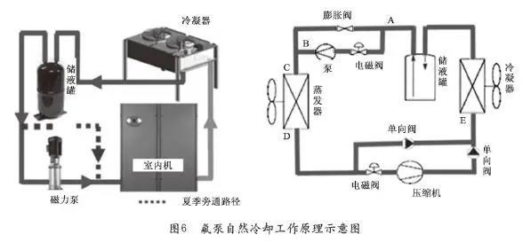 氟泵自然冷卻工作原理示意圖如圖6所示。室外溫度低于設(shè)定溫度時(shí),壓縮機(jī)停止,制冷劑旁通,氟泵帶動制冷劑循環(huán)實(shí)現(xiàn)熱量遷移到室外。由于氟泵的功率遠(yuǎn)低于壓縮機(jī),因此可以實(shí)現(xiàn)節(jié)能。