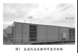 美國A運(yùn)營商美西某機(jī)房。如圖3所示,AHU安裝在樓頂,新風(fēng)經(jīng)過AHU后送入機(jī)房架高地板,氣流組織較好。配備風(fēng)冷冷機(jī)機(jī)械制冷在室外高溫、高濕、或高污染條件下開啟機(jī)械制冷?,F(xiàn)場參觀時(shí),室外溫度14℃,低于機(jī)房送風(fēng)溫度設(shè)定,但由于當(dāng)天下雨,室外空氣相對濕度較高,仍然需要啟用機(jī)械制冷對送風(fēng)進(jìn)行除濕;