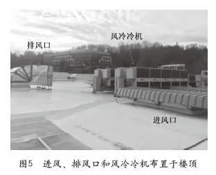 美國B運(yùn)營商美西某機(jī)房。該機(jī)房所在地緯度較高,十分適合采用自然冷卻。如圖4所示,AHU安裝在機(jī)房旁邊,新風(fēng)管和排風(fēng)管連接到屋頂通風(fēng)口。樓頂設(shè)置風(fēng)冷冷機(jī)用于機(jī)械制冷和除濕(圖5)。機(jī)房送風(fēng)采用上送上回,AHU通過安裝在吊頂?shù)娘L(fēng)管送到冷通道,熱通道密閉,通過吊頂靜壓箱回到AHU;