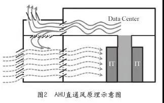 當(dāng)室外空氣溫度低于空調(diào)設(shè)定送風(fēng)溫度時(shí)直接采用新風(fēng)對機(jī)房進(jìn)行制冷,圖2為AHU直通風(fēng)原理示意圖。當(dāng)室外空氣低于送風(fēng)溫度設(shè)定時(shí),室外新風(fēng)與室內(nèi)部分回風(fēng)混合后送風(fēng)。當(dāng)室外空氣溫度較高或空氣質(zhì)量較差時(shí),采用機(jī)械制冷。當(dāng)室外濕度超出送風(fēng)設(shè)定范圍時(shí),開啟加濕或除濕功能。