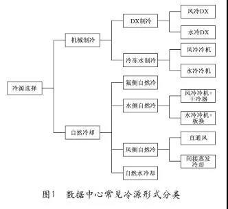 數(shù)據(jù)中心冷源形式多種多樣,可以從不同維度進(jìn)行歸類劃分。根據(jù)是否采用自然冷源,可以分為機(jī)械制冷和自然冷卻,根據(jù)末端工作媒介的不同可以劃分為DX制冷和冷凍水制冷;根據(jù)冷凝方式的不同可以進(jìn)一步分為風(fēng)冷和水冷;自然冷卻根據(jù)換熱介質(zhì)的不同可以分為風(fēng)側(cè)、水側(cè)、氟側(cè)自然冷和自然水冷卻(海水、湖水制冷)等形式。圖1系統(tǒng)歸類了數(shù)據(jù)中心常見冷源形式。
