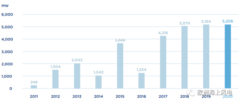 根據(jù)世界海上風(fēng)電論壇(WFO)最新發(fā)布的《 2020年全球海上風(fēng)電報告》,2020年海上風(fēng)電新增裝機(jī)容量為5206兆瓦,超過2019年的5194兆瓦(注:統(tǒng)計口徑為全部安裝并首臺或首批機(jī)組并網(wǎng)的海上風(fēng)場)。