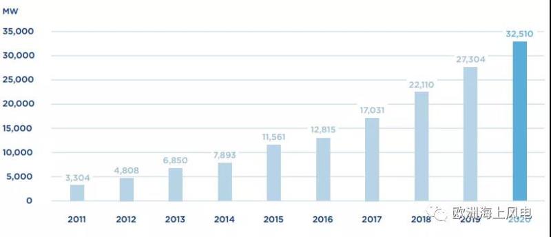 截至2020年底,全球海上風(fēng)電累計裝機(jī)容量32.5GW,比2018年底的數(shù)字增長了19.1%。