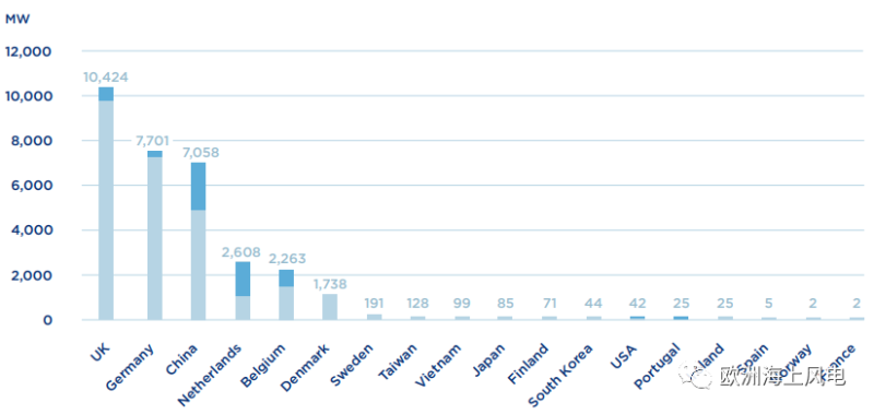 ▲各國海上風(fēng)電累計裝機(jī)容量