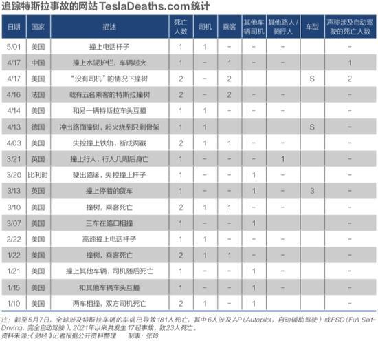 追蹤特斯拉事故的網(wǎng)站TeslaDeaths.com統(tǒng)計,截至5月7日,全球涉及特斯拉車輛的車禍已導(dǎo)致181人死亡,其中6人涉及AP(Autopilot,自動輔助駕駛)或FSD(Full Self-Driving,完全自動駕駛)。2021年以來共發(fā)生17起事故,致23人死亡。(見下圖表)
