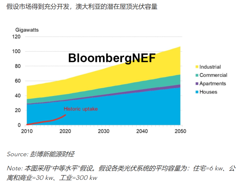 商業(yè)屋頂光伏市場(chǎng)的潛力巨大。充分開(kāi)發(fā)的工商業(yè)(C&I)光伏市場(chǎng)規(guī)模在2050年可以達(dá)到和戶用市場(chǎng)相媲美的水平。目前,澳大利亞僅有20%的商業(yè)屋頂安裝了光伏系統(tǒng)。但新的推動(dòng)租賃物業(yè)光伏系統(tǒng)安裝的商業(yè)模式對(duì)商業(yè)用戶的推動(dòng)甚于住宅用戶。