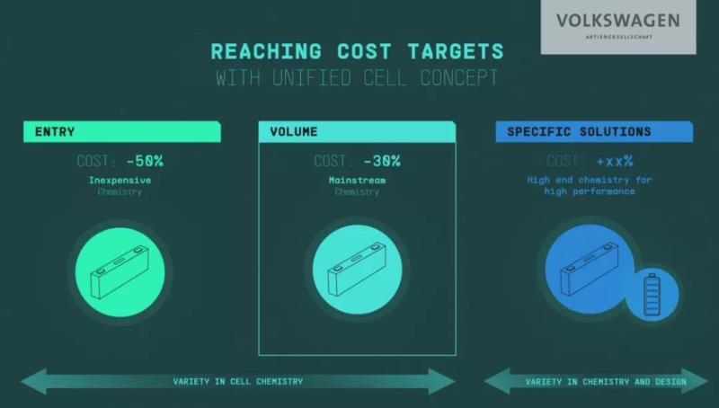 采用標(biāo)準(zhǔn)電芯可以有效降本。大眾集團(tuán)CEO迪斯預(yù)計(jì),標(biāo)準(zhǔn)電芯在量產(chǎn)車(chē)型中的成本將降低30%,在入門(mén)級(jí)車(chē)型中將降低50%。該公司的目標(biāo)是將電池成本降低至每千瓦時(shí)100歐元以下。