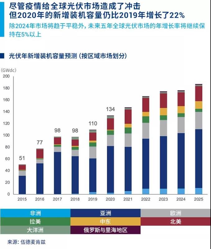 全球光伏市場(chǎng)持續(xù)面臨新冠肺炎疫情帶來(lái)的挑戰(zhàn)。2020年全球光伏市場(chǎng)的表現(xiàn)好于預(yù)期,新增裝機(jī)容量達(dá)到134GWdc,較2019年同比增長(zhǎng)22%。幾乎所有國(guó)家都解除了最嚴(yán)格的封鎖措施,目前項(xiàng)目建設(shè)仍得以按計(jì)劃推進(jìn)。預(yù)計(jì)至2025年,光伏市場(chǎng)年度新增裝機(jī)容量都將持續(xù)增長(zhǎng),最高將達(dá)到187GWdc。唯一的例外是2024年,年增長(zhǎng)率低于5%,主要原因在于著美國(guó)投資稅收抵免(ITC)政策延期放緩,本土光伏市場(chǎng)增速也將放緩。