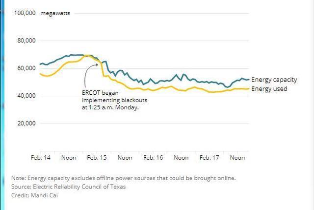 ↑ERCOT下令執(zhí)行輪流拉閘限電后,得州電力的供需變化表