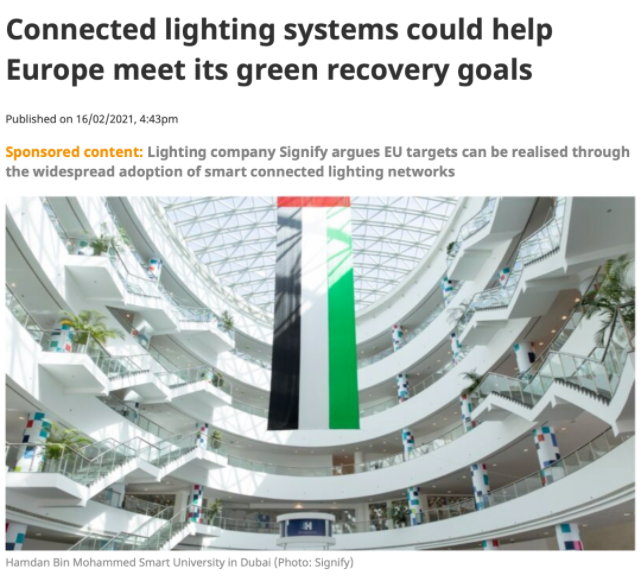 中國儲能網(wǎng)訊:據(jù)ClimateNews網(wǎng)站報(bào)道,照明燈具公司Signify認(rèn)為,廣泛采用智能連接的照明網(wǎng)絡(luò)可推動實(shí)現(xiàn)綠色轉(zhuǎn)型和碳中和。2018年,該公司在迪拜的哈姆丹·本·穆罕默德智能大學(xué)(HBMSU)安裝了最先進(jìn)的聯(lián)網(wǎng)照明系統(tǒng),這是一個(gè)沒有電燈開關(guān)的學(xué)習(xí)環(huán)境。